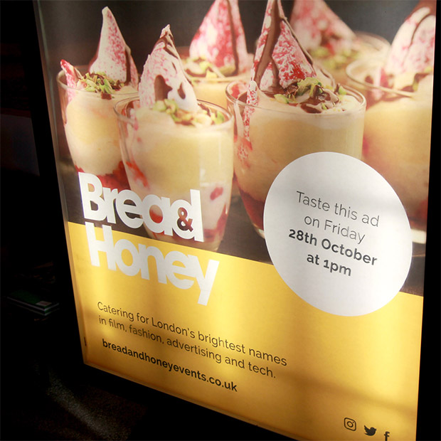 So, after a brainstorm, we decided to create a poster that we could bring to life. For the visual we picked one of our most favourite images from a selection of sweet canapés. If that wasn’t tempting enough, we then put an extra little note on the poster that told people to come and taste it on the final day it would appear in the agency. Intriguing, eh.